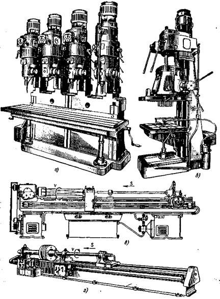 Станки для глубокого сверления (токарно-сверлильные) предназначены для сверления и рассверливания отверстий, длина которых во много раз превосходит их диаметр. Конструкция станков зависит от длины и диаметра обрабатываемого отверстия, длины и массы заготовки, а также от масштаба производства. Станки могут быть одно- и двусторонними, т. е. предназначенными для обработки отверстий с одной или с обеих сторон одновременно. В станках для сверления отверстий малого диаметра при длине не больше 1000 мм вращается обрабатываемая заготовка (рис. 11.5, в). Большие, тяжелые заготовки остаются во время обработки неподвижными, а инструмент (специальное сверло и борштанга с расточными резцами) получает вращение и осевую подачу (рис. 11.5, г).