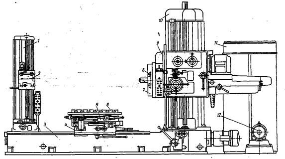 1 — задняя стойка; 2 — люнет; 3 — станина; 4 — продольные салазки стола; 5 — поперечные салазки стола; 6 — поворотный стол; 7 — планшайба; S — радиальный суппорт; 9 — шпиндельная бабка; 10 — передняя стойка; 11 — шкаф электрооборудования; 12 — электромашинный агрегат