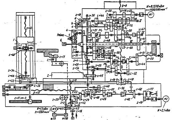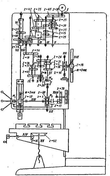 Движения в станке (рис. 11.2). Главное движение (вращение шпинделя) осуществляется от вертикально расположенного электродвигателя М (N=4,5 кВт; n=1450мин-1) через зубчатую передачу