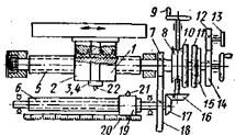 Таким образом, создается непрерывная индуктивная шкала отсчета координат. Учитывая, что датчик при движении со столом фиксирует каждый шаг винта-якоря, т. е. каждые 5 мм, необходимо, чтобы электроиндикатор включался только перед требуемым витком. Для этого служит передвижной упор 21, который устанавливают при наборе координат в соответствии с требуемым размером напротив заданного витка винта-якоря. Упор 21 закреплен на гайке 19, находящейся на вспомогательном винте 6. Винт 6 вращается от маховичка 9 через конические колеса 16—17.