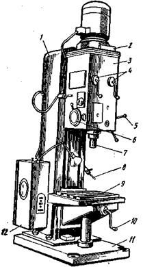 На станине 1 вертикально-сверлильного станка (рис. 11.1) размещены основные части станка. Станина имеет вертикальные направляющие, по которым перемещаются стол 9 и сверлильная головка 3, несущая шпиндель 7 и двигатель 2. Управление коробками скоростей и подач осуществляется рукоятками 4, ручная подача — штурвалом 5. Глубину обработки контролируют по лимбу 6. В нише размещены электрооборудование и противовес. В некоторых станках электрооборудование выносят в отдельный шкаф 12. Фундаментная плита 11 служит опорой станка. Стол 9 станка перемещают по направляющим с помощью винтового механизма маховичком 10. Охлаждающая жидкость подается электронасосом по шлангу 8.