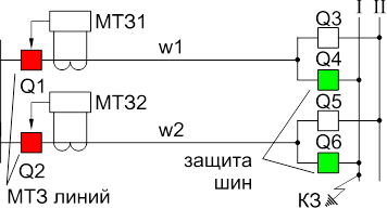 В случае нарушения принятой фиксации присоединений по шинам (например Q2 переведен на вторую секцию при помощи резервной системы шин и выключателя Q7) схема сохраняет селективность при внешних КЗ, но теряет её при КЗ на шинах.