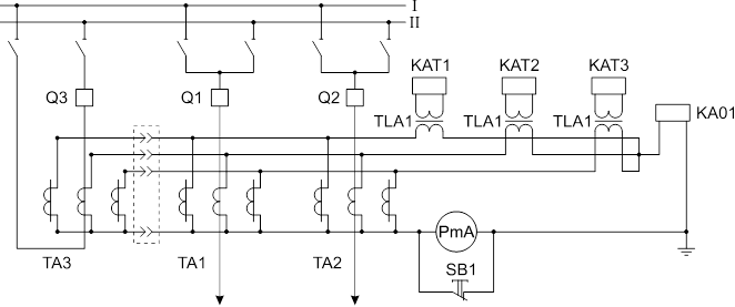 В нормальном режиме шиносоединительный выключатель отключен, и его трансформаторы тока не подсоединены к защите.