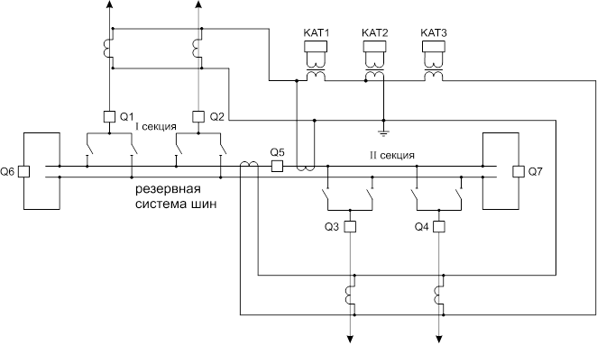 Подстанция нормально работает на одной системе шин, на которую включены все присоединения. Шиносоединительный выключатель Q3 отключен. Вторая система шин находится в резерве без напряжения.