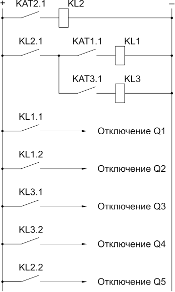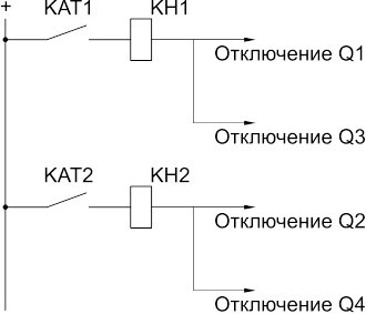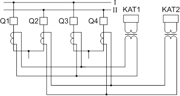 Комплект реле KAT2 – дифференциальная защита обеих секций, действующая при КЗ на шинах как первой, так и второй секции. Реле комплекта 2, подают + оперативного тока на реле комплектов 1 и 3 и производят отключение шиносоединительного выключателя.