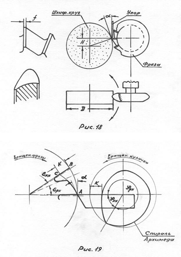 Приспособление для заточки (Рис18) имеет плоскую опорную линейку, по которой обкатывается копир, имеющий форму профиля фрезы. С копиром жестко связана затачиваемая фреза. Задний угол на фрезе образуется смещением оси шлифовального круга относительно оси фрезы на величину