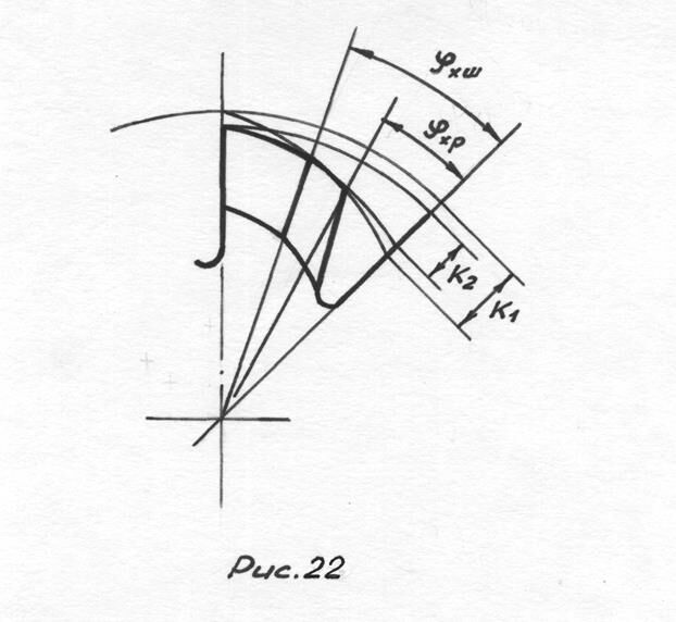 Это можно сделать, применив двойное затылование (рис.22). Осуществляется двойное затылование следующим образом. Сначала выполняется первое затылование резцом на всей длине зуба фрезы с величиной затылования KI. Затем, после термической обработки, производится затылование шлифовальным кругом на длине примерно 2/3 зуба с величиной затылования К2 = (0,6-0,8)КI. При этом пространство для выхода шлифовального круга из зацепления с зубом φхш значительно больше пространства для выхода из зацепления резца φкр.