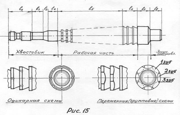Протяжки для круглых отверстий могут быть сконструированы по продольной (одинарного резания) или групповой (переменного резания) схемам резания (рис.15).