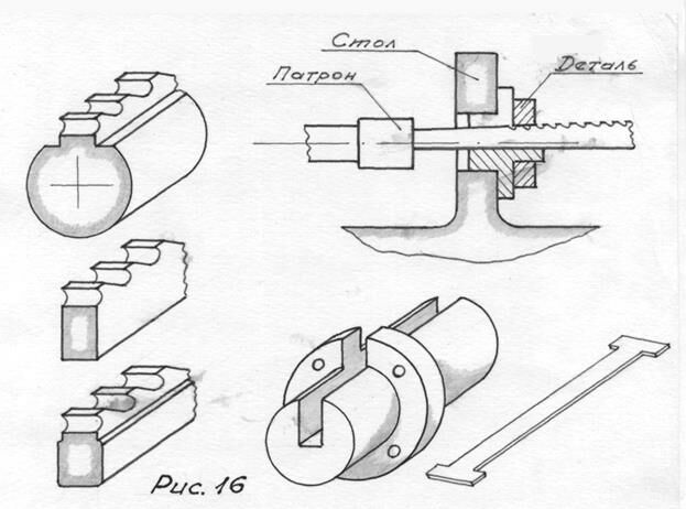 Шпоночные протяжки применяются для изготовления шпоночных канавок в отверстиях. По конструкции могут быть: с круглым телом, с плоским телом и с утолщённым телом, которое наиболее распространено (Рис.16). Обработка шпоночной протяжкой осуществляется с использованием специального приспособления для её центрирования относительно отверстия.