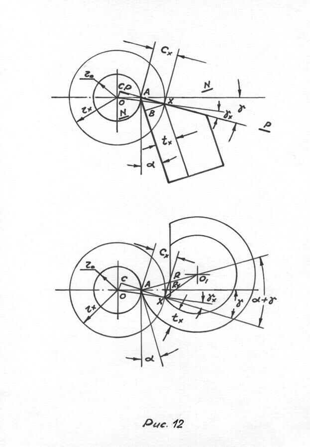 Для определения высот профиля в плоскости передний грани - СХ и в плоскости, нормальной к задней грани - tХ, можно воспользоваться расчетом с применением теоремы синусов или рассмотреть прямоугольные треугольники ∆ОСХ и ∆ОСА (рис. 12).