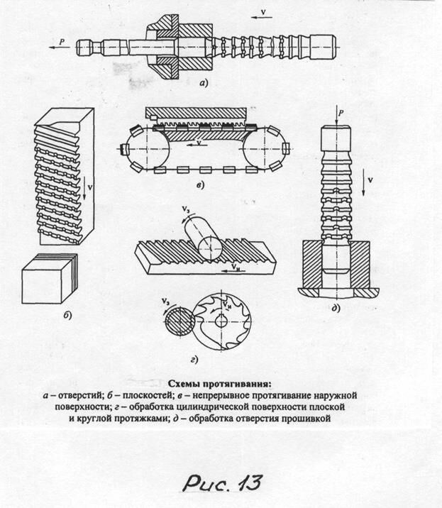 Протяжки предназначаются для обработки внутренних отверстий различной формы (рис. 13) и для обработки наружных поверхностей. Резание этими многозубыми инструментами осуществляется за счёт увеличения высоты или диаметра каждого последующего зуба по отношению к предыдущему.