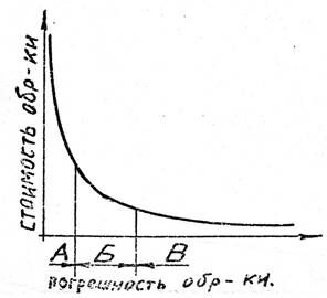 Понятие об экономической точности связано с тем, что для каждого станка существует некоторый интервал точности обработки Б (рис.6), характерный тем, что при выходе из него в сторону высших точностей (участок А) стоимость обработки начинает быстро возрастать, а при выходе в сторону низших (участок В) она уменьшается очень медленно. Этот средний интервал Б определяет границы, в которых лежит некая средняя "нормальная" для данного станка (экономическая) точность обработки.