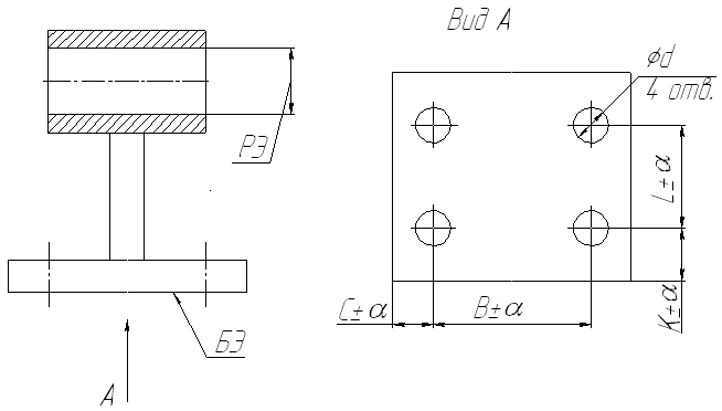 Четыре координирующих размера – L, В, С и К имеют, чаще всего, точность , а отверстия по 12 квалитету. Такие связки обычно обрабатываются за одну операцию сверлением в кондукторе. Схема обработки показана на рис.2. Главная база – плоскость,от которой задан скрытый размер – перпендикулярность осей отверстий относительно этой плоскости. Размеры L и В внутрикомплексные, размеры С и К исходные, для них выполняется принцип совмещения баз.