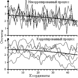 На рис. 17.1.5 приведен пример флюктуационной составляющей процесса X(t) (рис. 17.1.4) в десяти реализациях в сопоставлении со средним квадратическим отклонением ±s случайных величин от математического ожидания m(t).