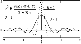 Рис. 17.4.4. Функции корреляции белого шума в частотном интервале 0-В. |