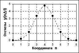 Пример дискретизации аналогового сигнала, приведенного на рис. 1.2.1, представлен на рис. 1.2.2. При Dt = const (равномерная дискретизация данных) дискретный сигнал можно описывать сокращенным обозначением y(n). В технической литературе в обозначениях дискретизированных функций иногда оставляют прежние индексы аргументов аналоговых функций, заключая последние в квадратные скобки - y[t]. При неравномерной дискретизации сигнала обозначения дискретных последовательностей (в текстовых описаниях) обычно заключаются в фигурные скобки - {s(ti)}, а значения отсчетов приводятся в виде таблиц с указанием значений координат ti. Для числовых последовательностей (равномерных и неравномерных) применяется и следующее числовое описание: s(ti) = {a1,a2, ..., aN}, t = t1,t2, ...,tN. Примеры дискретных геофизических сигналов - результаты вертикального электрического зондирования, профили геохимического опробования и т.п.