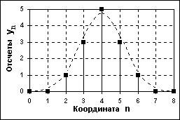 Рис. 1.2.2. Дискретный сигнал y(nDt) = 4.8 exp[-(nDt-4)2/2.8], Dt=1. |