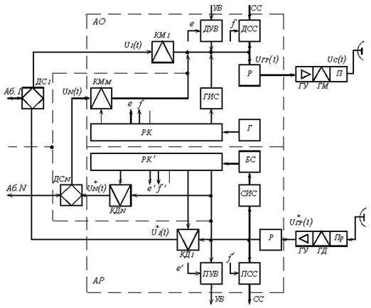 На приёме выделенный сигнал u*гр(t) подаётся на входы всех канальных демодуляторов КД1 … КДN и приемников служебной связи (ПСС), управления и вызова (ПУВ).