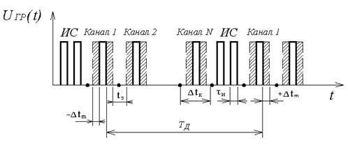 Помехоустойчивость систем передачи с ВРК во многом определяется точностью и надёжностью работы системы синхронизации и распределителей каналов, установленных в аппаратуре объединения и разделения каналов. Для обеспечения точности работы системы синхронизации импульсы синхронизации (ИС) должны иметь параметры, позволяющие наиболее просто и надёжно выделять их из последовательности импульсов группового сигнала u*гр(t). Наиболее целесообразным при ФИМ оказалось применение сдвоенных ИС, для передачи которых выделяют один из канальных интервалов ∆tк в каждом периоде дискретизации Тд (смотри рисунок 1.4.2).