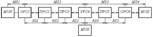 На ОРС1 заканчивается мультиплексная секция MS1 кабельной соединительной линии между мультиплексным оборудованием MUX и оконечной радиорелейной станцией (ОРС) и начинаются мультиплексная MS2 и регенерационная RS1 секции РРЛ. Регенерационные секции радиорелейной линии начинаются и заканчиваются на всех пролетах. Мультиплексные секции радиорелейной линии начинаются и заканчиваются на ОРС и узловой радиорелейной станции (УРС), следовательно, на ОРС и УРС обрабатывается весь заголовок SOH STM, включая AU указатель. На промежуточной станции (ПРС) обрабатывается только заголовок регенерационной секции RSOH, а остальная часть заголовка проходит через эти станции транзитом.