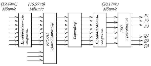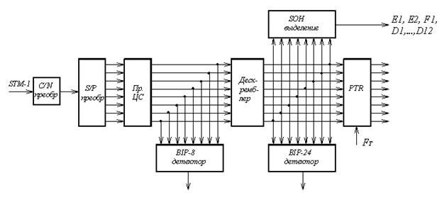 Здесь же осуществляется преобразование входного цифрового потока 155.52 Мбит/с в восемь параллельных потоков по 19.44 Мбит/с (S/P-преобразователь), для того чтобы в дальнейшем можно было использовать микросхемотехнику с невысоким быстродействием, но при этом количество комплектов оборудования увеличивается в восемь раз. Для обеспечения этих преобразований (C/N и S/P) необходимо тактовая частота, которая выделяется из входного сигнала.
