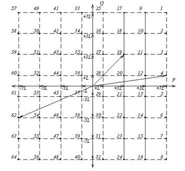 В смесителях осуществляется амплитудная и фазовая модуляция по каждой из составляющих, после сложения которых получается сигнал 64 КАМ, расположение точек которой на фазово-амплитудной плоскости (созвездии) представлено на рисунке 2.3.7.