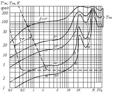 Рассмотрение кривых рисунка 4.2.2 показывает, что при уменьшении β величина Тэ.а растет настолько быстро, что использование величины β<5º нецелесообразно. Следует отметить, что при малых β увеличивается вероятность от наземных радиотехнических средств и промышленных объектов. Максимумы на частотах 22, 23 и 60 ГГц объясняются поглощением в водяных парах и кислороде атмосферы соответственно.