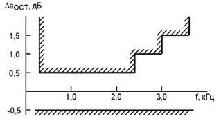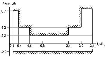 Эффективно передаваемая полоса частот канала ТЧ – полоса, на крайних частотах которой (0.3 и 3.4 кГц) остаточное затухание на 8.7 дБ превышает остаточное затухание на частоте 800 Гц. Частотная характеристика отклонения канала ТЧ от номинала 7 дБ должна оставаться в пределах шаблона (рисунок 3.2.4) при максимальном числе транзитов, т.е. при 12 переприемных участках.