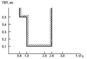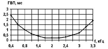 Фазочастотные искажения не являются столь существенным при передаче речи. Но так как каналы ТЧ используются также для передачи данных и факсимильной связи, большие фазочастотные искажения недопустимы. Поэтому нормируется отклонение группового времени передачи (ГВП) от его значении на частоте 1900 Гц на одном транзитном участке длиной 2500 км (рисунок 3.2.5).