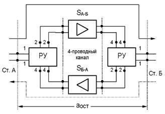 Основная трудность при организации перехода от четырех- к двухпроводному каналу с помощью РУ состоит в появлении петли обратной связи (ОС). Сигнал, попадая в двухпроводный канал, начинает циркулировать по петле ОС, что приводит к искажениям формы сигналов и в пределе – к самовозбуждению канала.