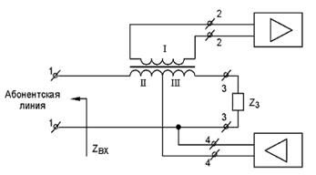 В качестве РУ в современных системах передачи широко используется дифференциальная система (ДС), выполненная на основе симметричного трансформатора со средней точкой (рисунок 3.3.2) (полуобмотки II и III идентичны). В состав ДС входит сопротивление Z3, называемое балансным. Оно приближенно отражает свойства входного сопротивления абонентской линии.