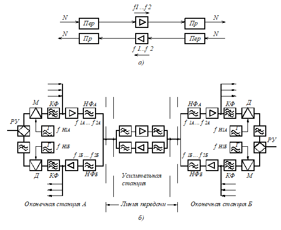 Рисунок 3.4.1 – Однополосный четырехпроводный (а) и двухпоплосный двухпроводный (б) линейные тракты