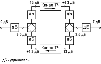 Телефонный канал включает в себя двухпроводное окончание и четырехпроводный тракт. Дифсистема (ДС) служит для перехода с четырехпроводного тракта к двухпроводному окончанию. Удлинители в двухпроводном окончании имеют затухание 3.5 дБ и называются транзитными. Характеристики канала ТЧ нормируются рекомендациями МСЭ-Т серии М.