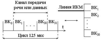 Временная коммутация. Временное разделение может реализоваться, например с помощью импульсно-кодовой модуляции. В ТФ-ОП России, как и в сетях Европы, используются тридцатиканальные ЦСП с ИКМ. В групповом тракте одного направления передачи (например, в двухпроводной кабельной физической линии) такой ЦСП организуется 30 разделённых во времени каналов (ВК) для передачи речевой информации или данных и двух специальных канала. Такое разделение 30 каналов, предоставляемых пользователям, показано на рисунке 3.7.3, а. Коммутационные поля цифровых станций и узлов строятся с использованием пространственно-временной коммутации. Пусть для каждого ВК существует ячейка памяти, где код данных хранится в течение цикла. На рисунке 3.7.3, б ячейки, закреплённые за одной линией ИКМ, показаны вертикальными линиями. Также имеются промежуточные линии (горизонтальные), по которым содержимое любой ячейки может быть прочитано в любом нужном временном положении. Процесс такого считывания и называется временной коммутацией.