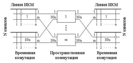 Тип коммутации, приведённой на схеме, называют время – пространство – время (В – П – В). Как и на рисунке 3.7.2, здесь число входящих и исходящих каналов равно N. Эти каналы представлены в N/n входящих и исходящих линиях ИКМ. Работа такой коммутационной схемы аналогична работе трёхзвенной пространственной коммутационной (смотри рисунок 3.7.2). В пространственных коммутаторах второй ступени устанавливаются соединения временных каналов исходящих и входящих линий ИКМ.
