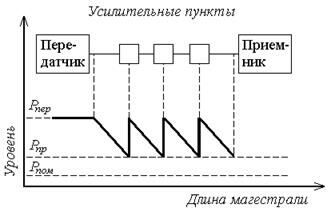 В системах передачи применяется способ компенсации затухания сигналов повышением мощности сигнала в нескольких равномерно расположенных точках тракта. Часть канала связи между соседними промежуточными усилителями называется усилительным участком. Изменение уровней сигнала вдоль магистрали описывается диаграммой уровней, приведенной на рисунке 3.2.3.