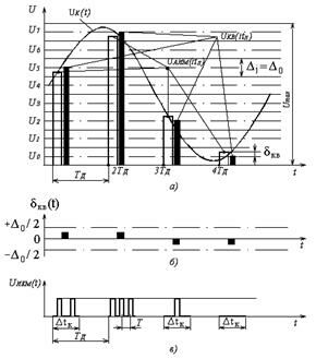 то квантованному импульсу uкв(iTд) присваивается амплитуда разрешённого uj уровня квантования (смотри рисунок 5.1.1, а). При этом возникает ошибка квантования δкв, представляющая разность между передаваемой квантованной величиной uкв(iTд) и истинным значением непрерывного сигнала в данный момент времени uАИМ(iTд) (смотри рисунок 5.1.1, б):