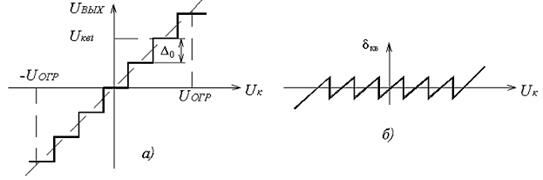 Амплитудная характеристика квантующего устройства при равномерной шкале квантования приведена на рисунке 5.1.2, а. Она имеет ступенчатую форму, и при изменении непрерывного сообщения uк(t) и соответствующего ему АИМ сигнала uАИМ(iTд) в пределах одной ступени выходной сигнал остаётся постоянным, а при достижении границы этой ступени изменяется скачком на величину шага квантования. При этом ошибка квантования зависит от uк(t) и имеет вид, изображённый на рисунке 5.1.2, б.