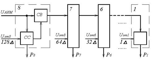 Если на входе ССi амплитуда поступающего АИМ сигнала равна или превышает Uэтi, то на выходе схемы сравнения формируется «1», а в СВi из входного сигнала вычитается Uэтi, после чего он поступает на вход следующей ячейки. Если же амплитуда АИМ сигнала на входе ССi меньше Uэтi, то на выходе ССi формируется «0» и АИМ сигнал проходит через СВi без изменений. После окончания процесса кодирования текущего отсчёта на выходе кодера получается восьмиразрядный параллельный код, кодер устанавливается в исходное состояние и начинается кодирование следующего отсчёта.