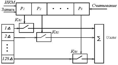 В линейном декодере (рисунок 5.1.4) под воздействием управляющих сигналов, поступающих от генераторного оборудования, в регистр сдвига записывается очередная восьмиразрядная кодовая комбинация. В момент прихода импульса считывания замыкаются только те ключи Кл1 … Кл8, которые соответствуют разрядам, имеющим значения «1». В результате в сумматоре объединяются соответствующие эталонные напряжения и на его выходе получается соответствующая амплитуда АИМ отсчёта.