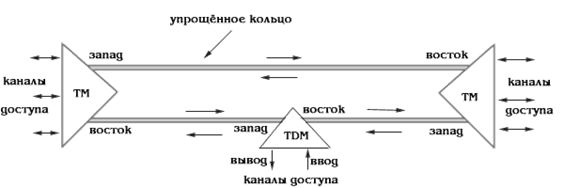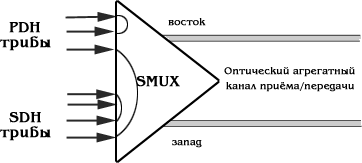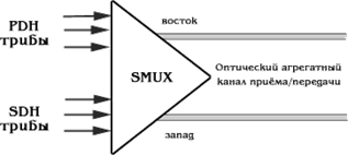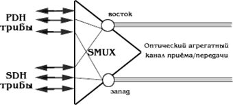 Терминальный мультиплексор TM является мультиплексором и оконечным устройством SDH сети с каналами доступа, соответствующим трибам доступа PDH и SDH иерархии (рисунок 6.1.1). Терминальный мультиплексор может либо вводить каналы, т.е. коммутировать их со входа трибного интерфейса на линейный выход, или выводить каналы, т.е. коммутировать с линейного входа на выход трибного интерфейса. Мультиплексор ввода/вывода ADM может иметь на входе тот же набор трибов, что и терминальный мультиплексор (рисунок 6.1.1). Он позволяет вводить/выводить соответствующие им каналы. Дополнительно к возможностям коммутации, обеспечиваемым ТМ, ADM позволяет осуществлять сквозную коммутацию выходных потоков в обоих направлениях, а также осуществлять замыкание канала приёма на канал передачи на обоих сторонах ( «восточный» и «западный») в случае выхода из строя одного из направлений. Наконец, он позволяет (в случае аварийного выхода из строя мультиплексора) пропускать основной оптический поток мимо него в обходном режиме. Всё это даёт возможность использовать ADM в топологиях типа кольца.