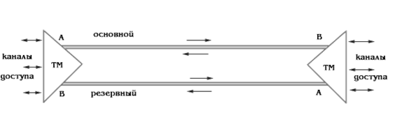 Топология «точка-точка». Сегмент сети, связывающий два узла A и B, или топология «точка – точка», является наиболее простым примером базовой топологии SDH сети (рисунок 6.2.1). Она может быть реализована с помощью терминальных мультиплексоров ТМ, как по схеме без резервирования канала приёма/передачи, так и по схеме со стопроцентным резервированием типа 1+1, использующей основной и резервный электрические или оптические агрегатные выходы (каналы приёма/передачи).