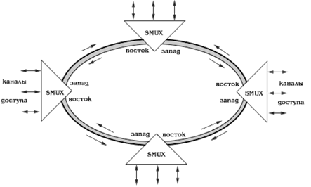 Топология «кольцо ». Эта топология (рисунок 6.2.4) широко используется для построения SDH сетей первых двух уровней SDH иерархии (155 и 622 Мбит/с). Основное преимущество этой топологии – лёгкость организации защиты типа 1+1, благодаря наличию в синхронных мультиплексорах SMUX двух пар оптических каналов приёма/передачи: восток – запад, дающих возможность формирования двойного кольца со встречными потоками.