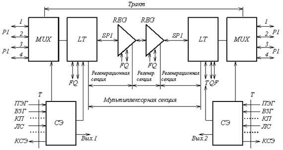 Блоки MUX и LT (рисунок 6.2.5) конструктивно образуют единый модуль, основой которого является мультиплексор (МТ). Упрощённая структура трактов и секций сети SDH приведена на рисунке 6.2.5.