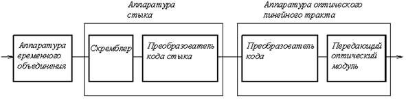 Для каждой иерархической скорости МККТТ рекомендует свои коды стыка, например для вторичной – код HDB-3, для четверичной – код CMI и так далее. Операцию преобразования бинарного сигнала, поступающего от аппаратуры временного объединения в код стыка, выполняет преобразователь кода стыка. Код стыка может отличаться от кода принятого в оптическом линейном тракте. Операцию преобразования кода стыка в код цифровой ВОСП выполняет преобразователь кода линейного тракта, на выходе которого получается цифровой электрический сигнал, модулирующий ток излучателя передающего оптического модуля. Таким образом, волоконно-оптические системы передачи строятся на базе стандартных систем ИКМ заменой аппаратуры электрического линейного тракта на аппаратуру оптического линейного тракта.