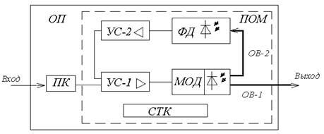 На рисунке 7.4.1 представлена структурная схема оптического передатчика (ОП) с прямой модуляцией несущей. Преобразователь кода ПК преобразует стыковой код, в код, используемый в линии, после чего сигнал поступает на модулятор. Схема оптического модулятора исполняется в виде передающего оптического модуля (ПОМ), который помимо модулятора содержит схемы стабилизации мощности и частоты излучения полупроводникового лазера или светоизлучающего диода. Здесь модулирующий сигнал через дифференциальный усилитель УС-1 поступает в прямой модулятор с излучателем (МОД). Модулированный оптический сигнал излучается в основное волокно ОВ-1. Для контроля мощности излучаемого оптического сигнала используется фотодиод (ФД), на который через вспомогательное волокно ОВ-2 подается часть излучаемого оптического сигнала. Напряжение на выходе фотодиода, отображающее все изменения оптической мощности излучателя, усиливается усилителем УС-2 и подается на инвертирующий вход усилителя УС-1. Таким образом, создается петля отрицательной обратной связи, охватывающая излучатель. Благодаря введению ООС обеспечивается стабилизация рабочей точки излучателя. Для уменьшения температурной зависимости порогового тока в передающем оптическом модуле имеется схема термокомпенсации (СТК), поддерживающая внутри ПОМ постоянную температуру с заданным отклонением от номинального значения. Современные микрохолодильники позволяют получать отклонения не более тысячных долей градуса.