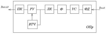 Оптический приемник. Структурная схема оптического приемника (ОПр) показана на рисунке 7.4.2. Приемник содержит фотодетектор (ФД) для преобразования оптического сигнала в электрический. Малошумящий усилитель (УС) для усиления полученного электрического сигнала до номинального уровня. Усиленный сигнал через фильтр (Ф), формирующий частотную характеристику приемника, обеспечивающую квазиоптимальный прием, поступает в устройство линейной коррекции (ЛК). В ЛК компенсируются частотные искажения электрической цепи на стыке фотодиода и первого транзистора усилителя. После преобразований сигнал поступает на вход решающего устройства (РУ), где под действием тактовых импульсов, поступающих от устройства выделения тактовой частоты (ВТЧ), принимается решение о принятом символе. На выходе оптического приёмника имеется преобразователь кода (ПК), преобразующий код линейный в стыковой код.