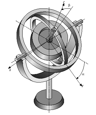 Определение: Карданов подвес представляет собой систему твердых тел (рамок, колец), последовательно соединенных между собой цилиндрическими шарнирами. Обычно при отсутствии технологических погрешностей оси рамок карданова подвеса пересекаются в одной точке — центре подвеса (смотри рис. 5.1). Гироскоп, у которого центр масс совпадает с центром подвеса, называется уравновешенным или свободным.