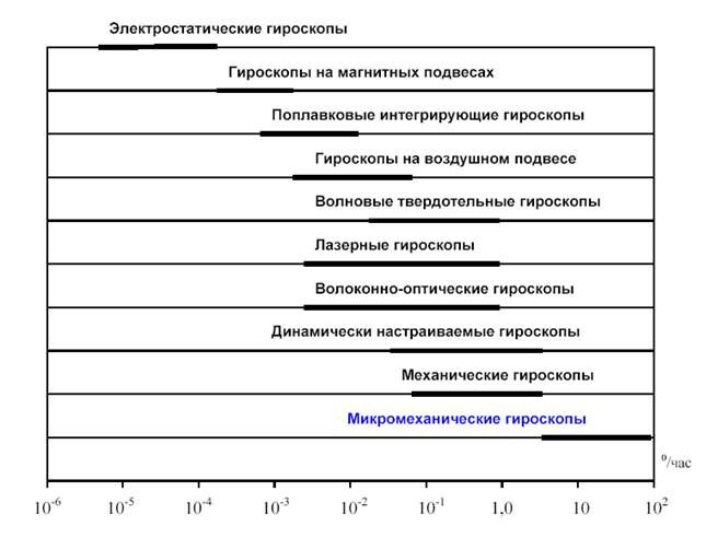 | Рис. 5.2. Диаграмма со сводными данными о точности гироскопов разных типов |