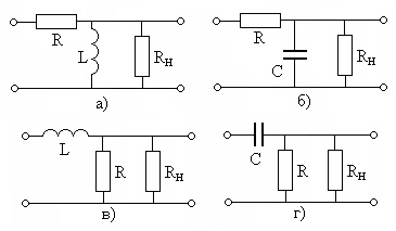 На рис. 3.6а и рис. 3.6б показаны два ФНЧ, а на рис. 3.6в и рис. 3.6г – два ФВЧ. В качестве примера рассмотрим ФНЧ рис. 3.6а.